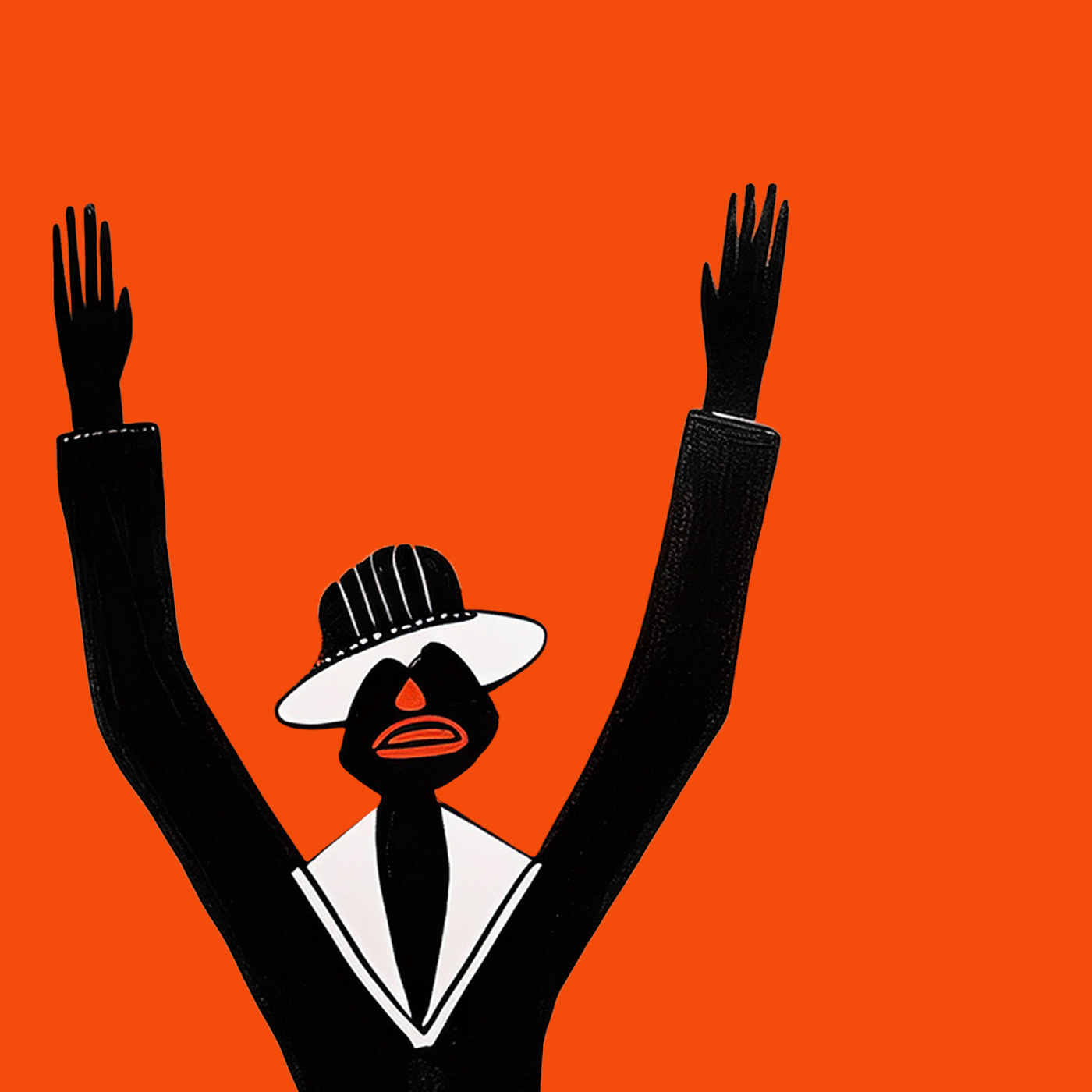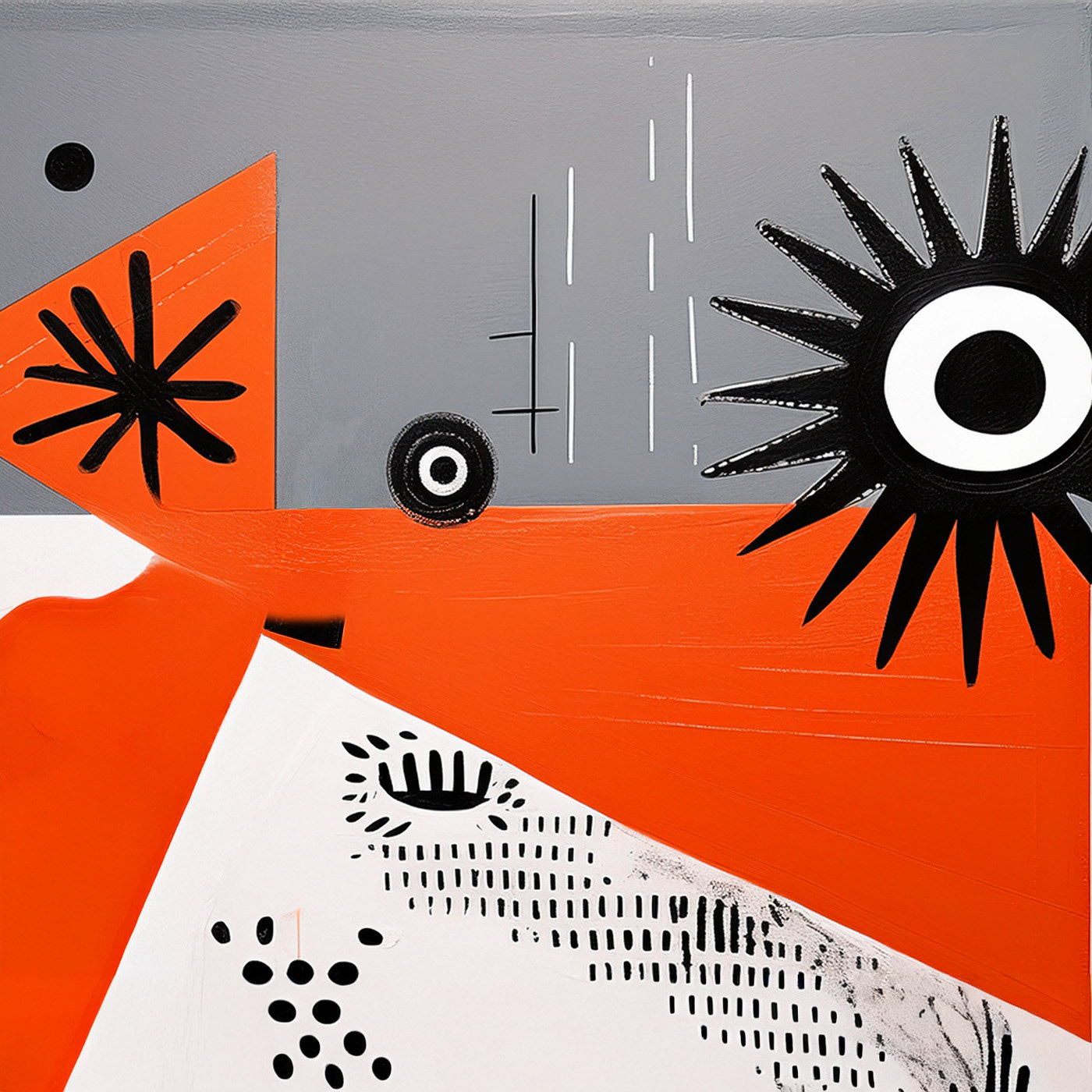 Around this figure, I layered sharp blocks of orange, black, white, and grey. The orange cuts through the composition like a decisive step forward, while the cooler tones steady the frame. Tribal-inspired marks, sunburst shapes, and circular motifs surround the character, blending modern energy with the cultural visual language that influences so much of my work. Together, these elements create a rhythm — a sense that progress comes in pulses, not straight lines.
